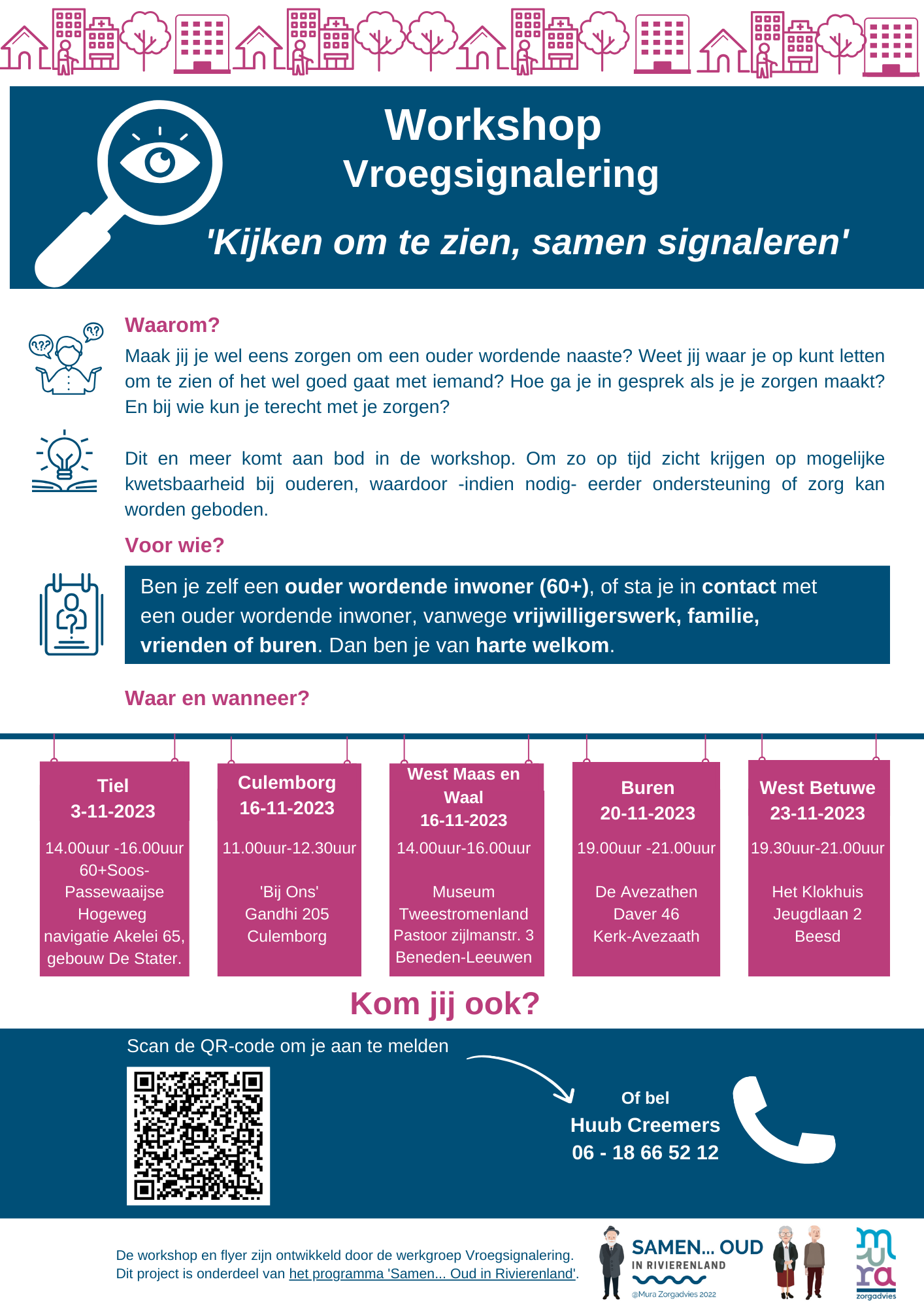 Maak jij je weleens zorgen om een ouder wordende naaste? Weet je waar je op kunt letten om te zien of het wel goed gaat met iemand? Hoe ga je in gesprek als je je zorgen maakt? En waar kan je terecht met vragen? Of ben je zelf een ouder wordende inwoner (60+)?